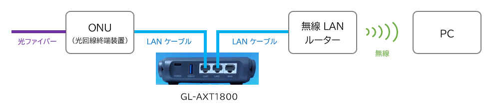 LAN ケーブルの途中にルーター GL-AXT1800 を挟みます。